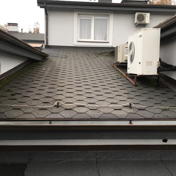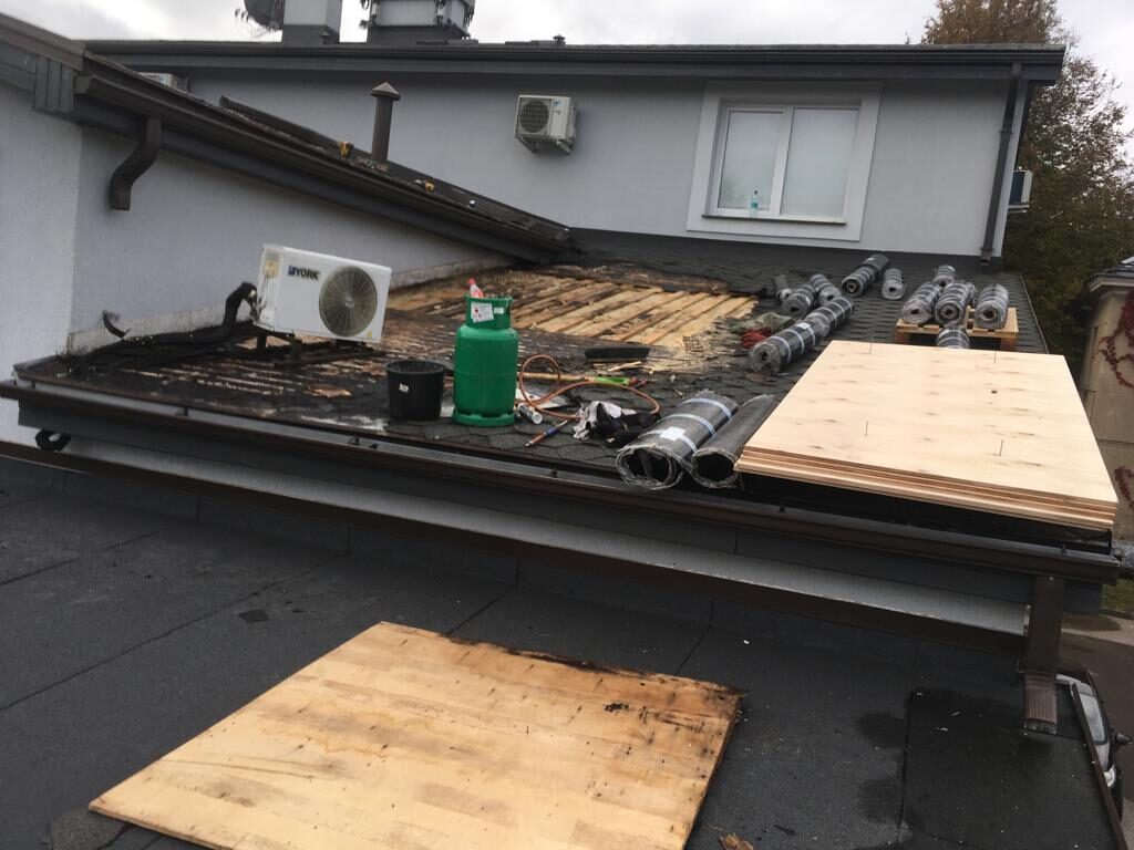 Šindeļu jumta demontāža un bojāto OSB plākšņu nomaiņa. Vietā - apakšklājs mehāniski piestiprināts( pieskrūvēts), uz tā uzkausēts ruberoīda virsklājs.